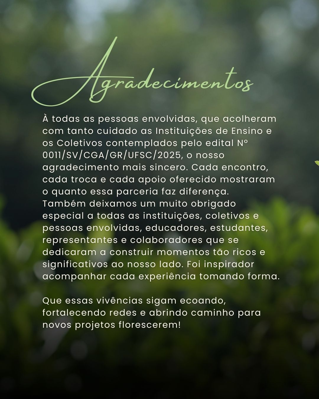 Agradecemos a todas as pessoas, instituições e coletivos que caminharam conosco neste semestre. Que essas experiências continuem ecoando, inspirando novas ações, projetos e redes de colaboração.